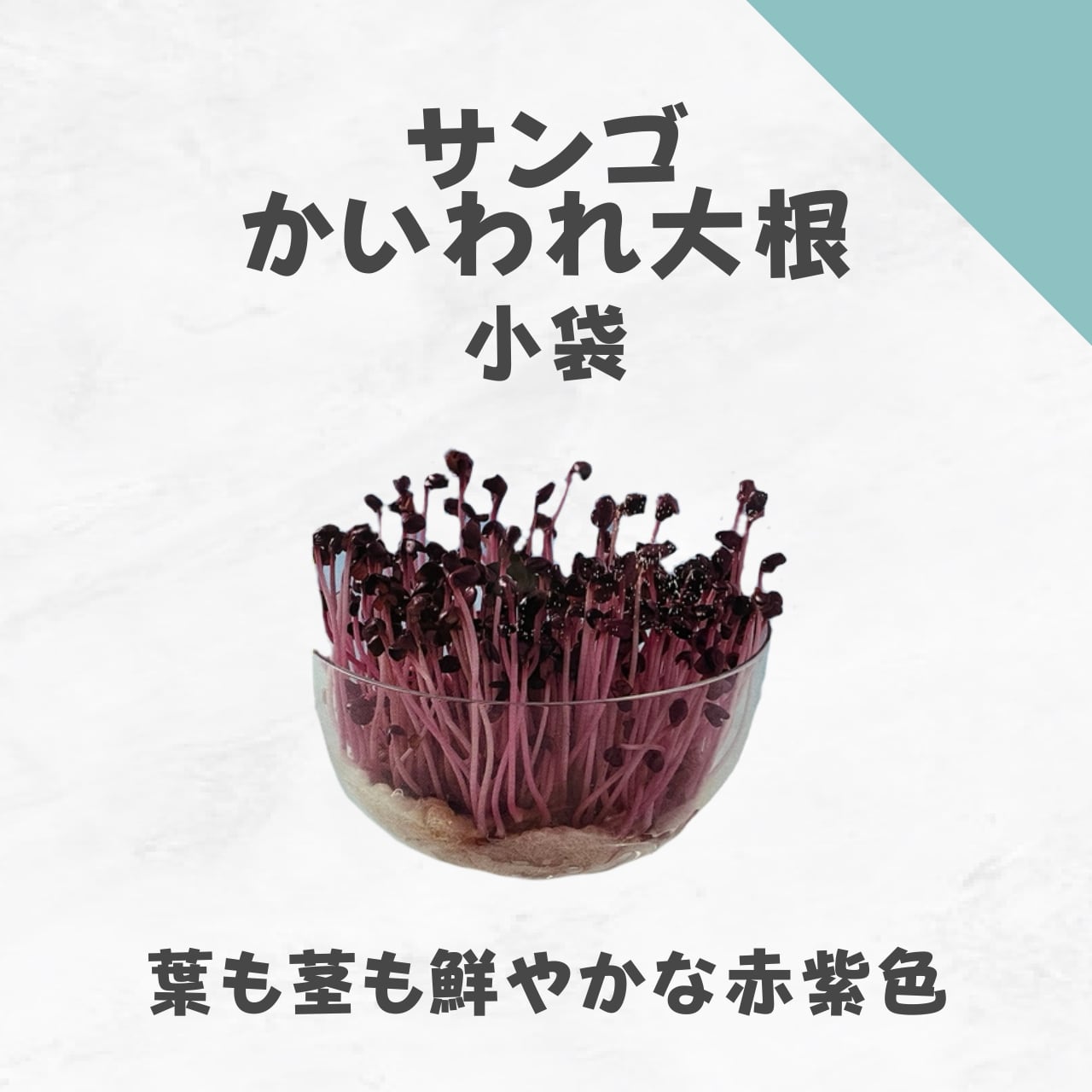 葉も茎も鮮やかな赤紫色になるかいわれ大根。ビタミンA、B1、C、ミネラル(鉄分、リン)が豊富に含まれる。