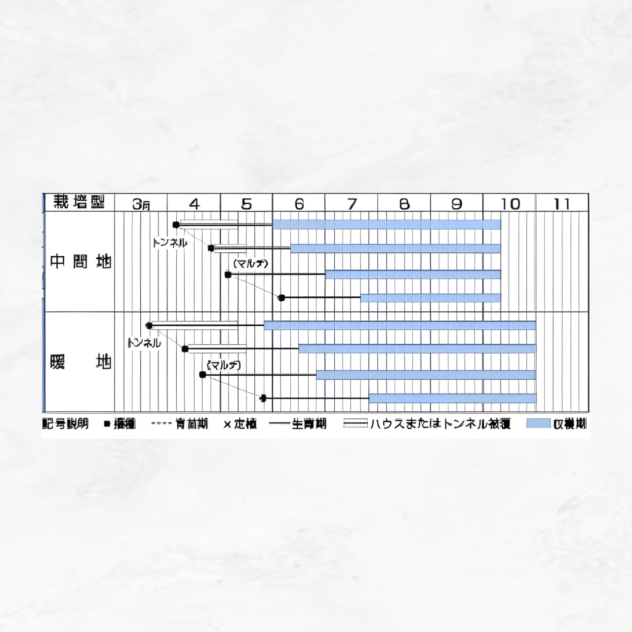 ●草勢旺盛な品種のため、水はけのよい畑土が適する。水田土等では高畝にし排水性を高めること。