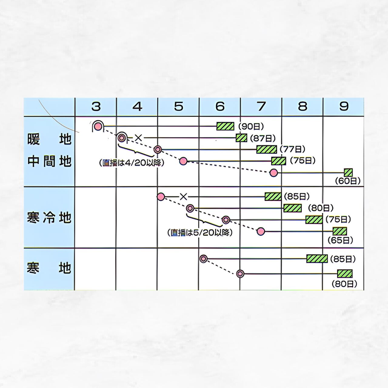 ●中間地の3月下旬から4月まきトンネル露地作型、冷涼地の5月中旬から6月上旬まきの露地作型が最適。