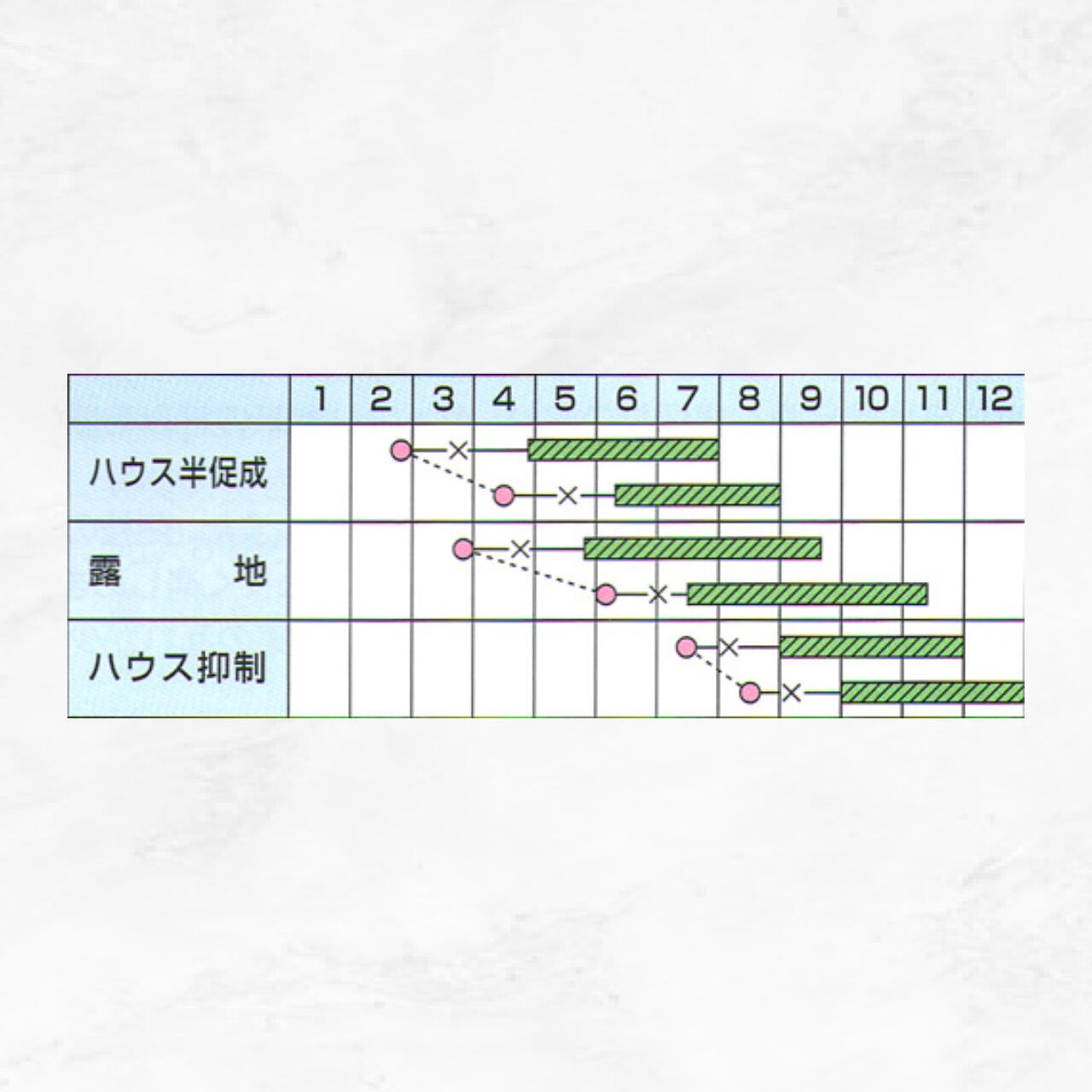 ●適応作型は、露地栽培が最適、半促成・ハウス抑制にも適す。