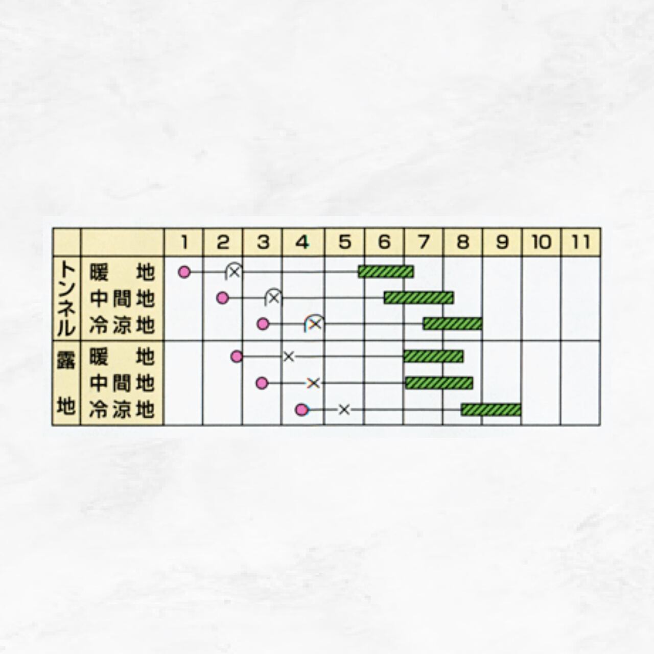 ●発芽適温は特に高め(28~30℃)なので、播種期は十分な温度管理を行うこと。