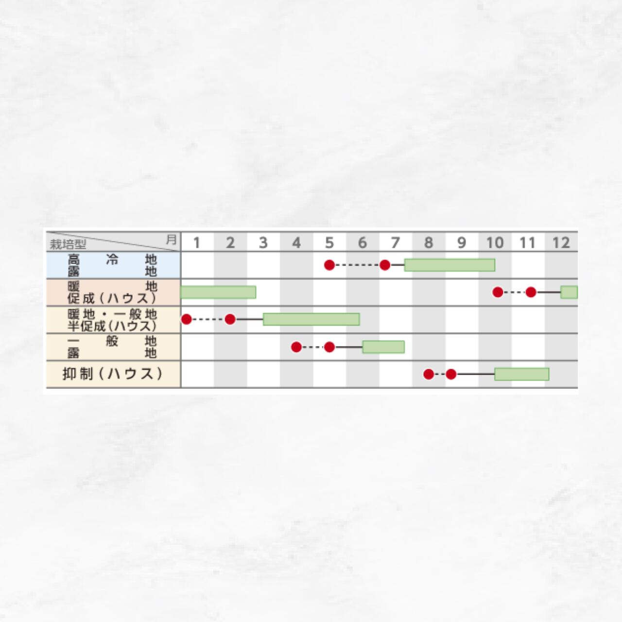 ●ハウス栽培から露地栽培のほか、パイプハウスを利用した抑制栽培までいずれの作型にも適するが、高温期は莢がつかなくなるので注意が必要。