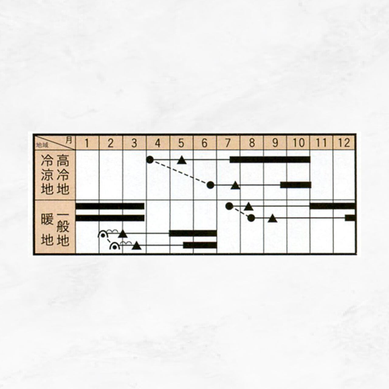●春作(1~3月まき)と夏作(高冷地4~6月まき)、秋作(7~8月まき)の三期まきが可能。