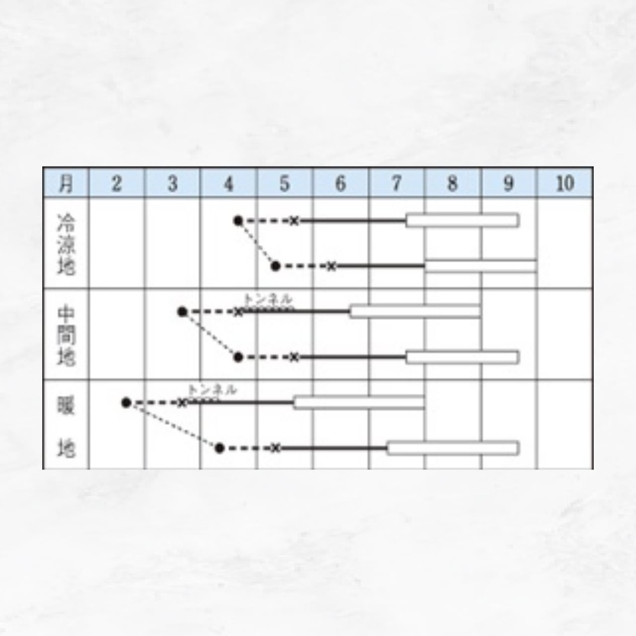 ●畝幅3m、株間2m、本葉7~8枚で摘芯し、4本仕立てとする。