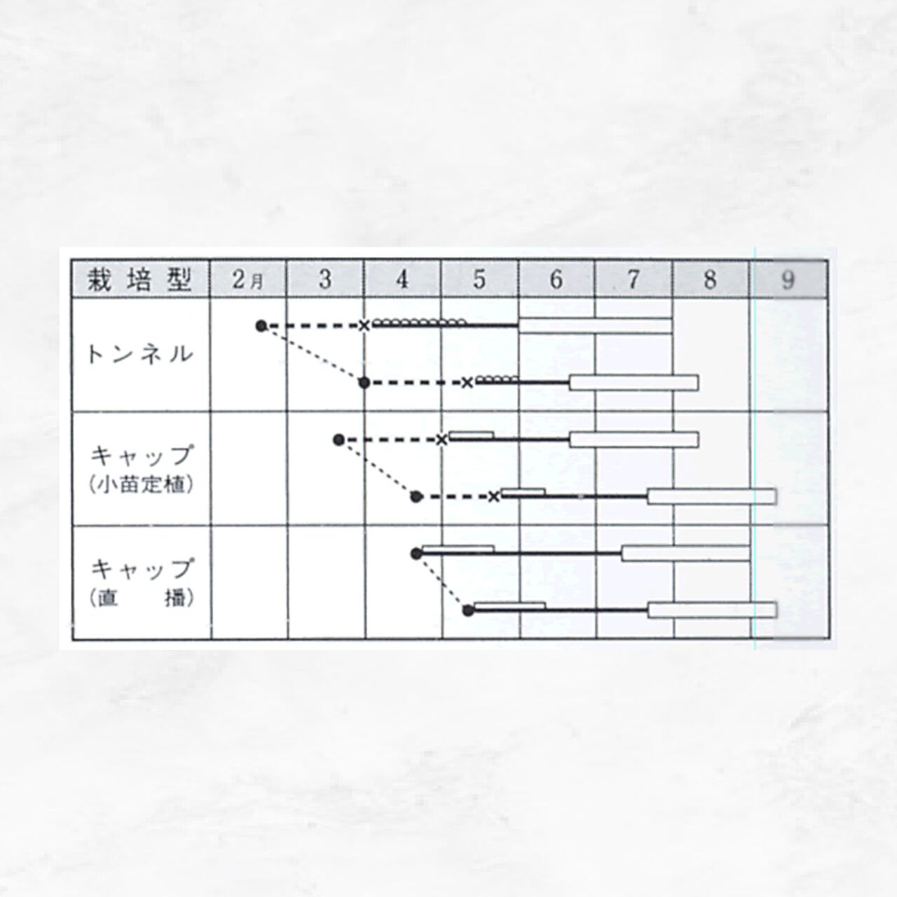 ●本品種は一般的なトンネル・露地栽培を基本とする。定植時は地温を18℃以上確保し、活着後、潅水量を控えめにして、根張りのよい株に仕上げる。