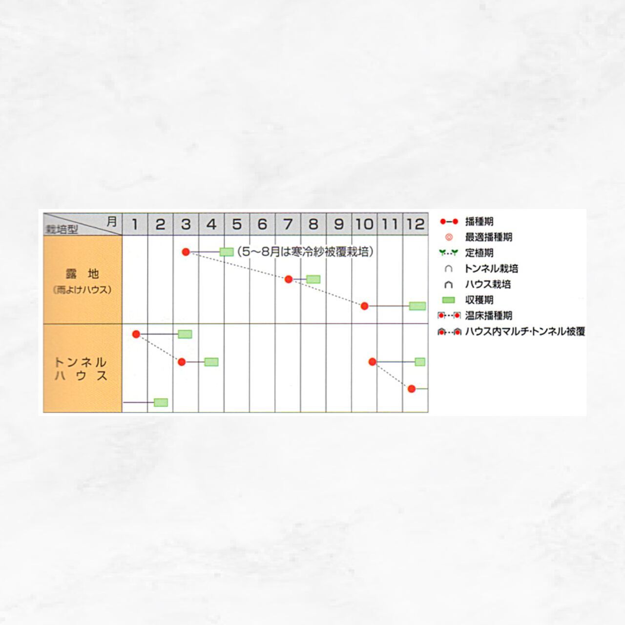 温暖地の露地栽培で4月上旬~10月上旬、寒冷地では4月下旬~9月上旬播種で栽培できる。春、秋作で問題となる白さび病に強い品種である。ハウスやトンネルを利用することで周年栽培も可能で、特に耐暑性を生かした高温期の栽培で威力を発揮する。