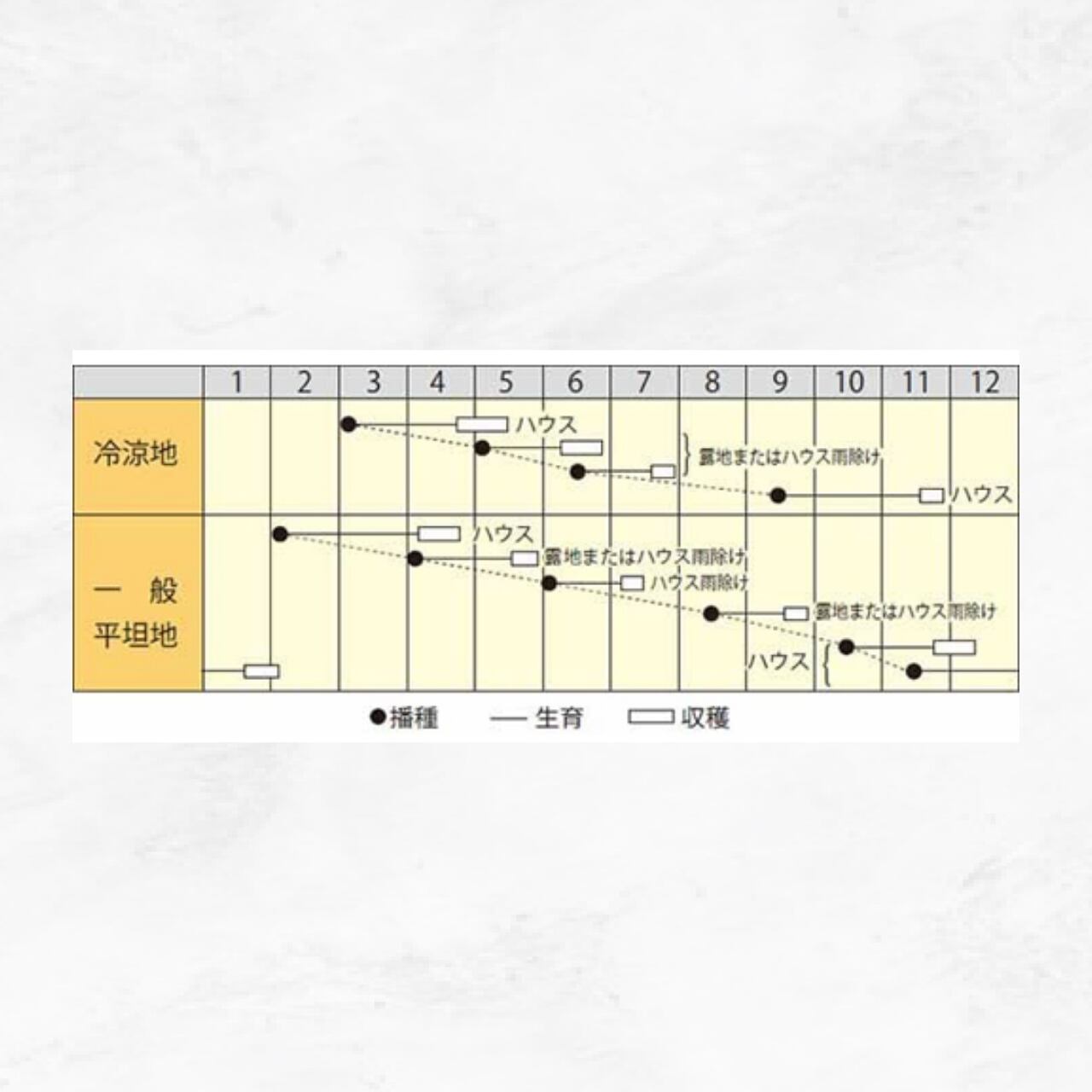 ●周年出荷向きの品種で、収穫の目安は春・秋蒔きは40~60日、夏蒔きで30~40日程度。