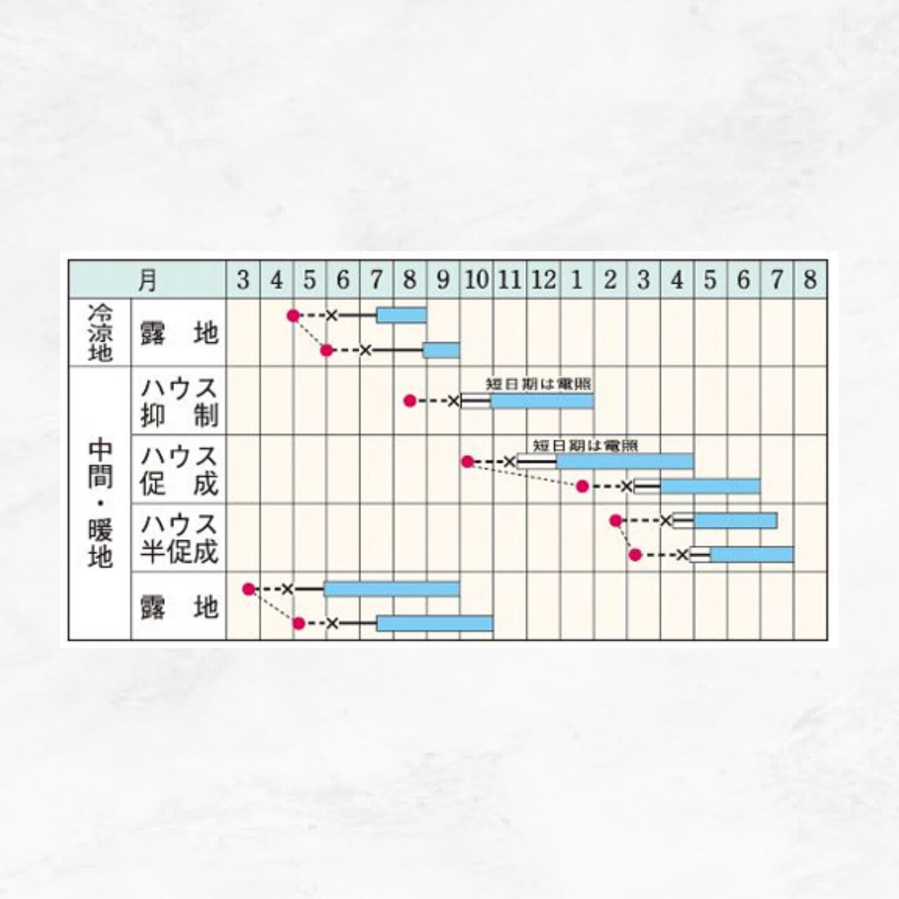 ●ハウスなどを利用した短日期の栽培では電照を行い、最低11℃以下にならないようにする。