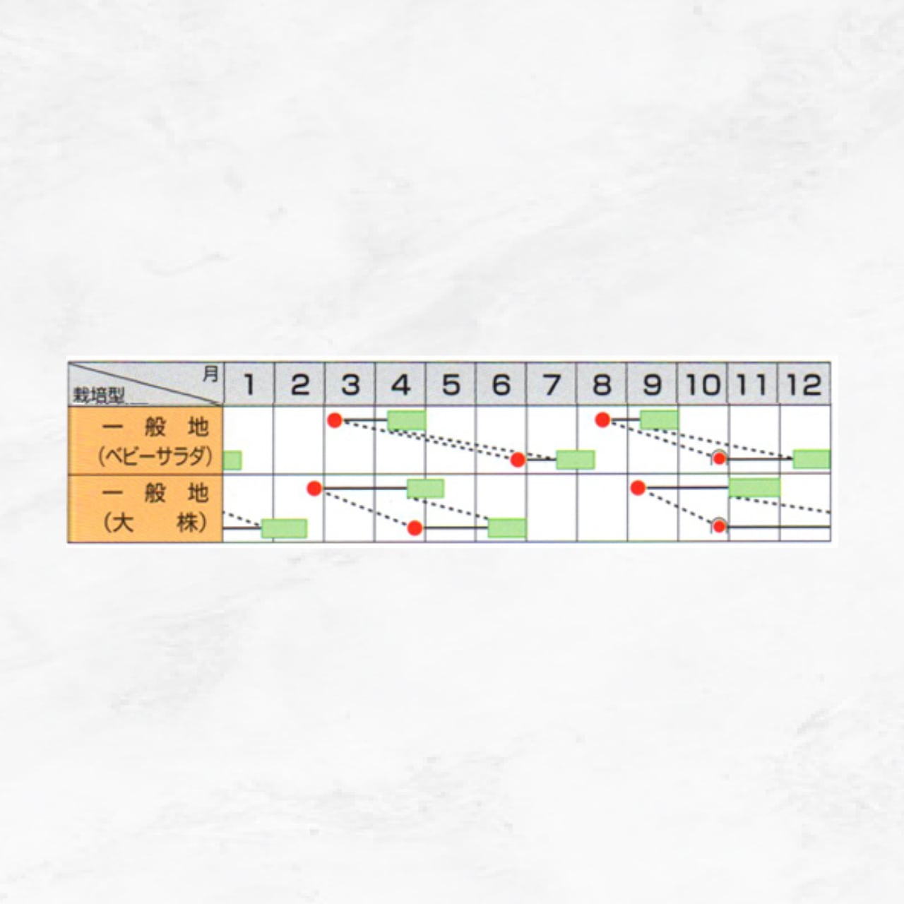 ●ベビーレタスで収穫する場合、温暖地では3月上旬~6月上旬と、8月中旬~10月下旬に播種して、30~50日で収穫できます。大株で収穫する場合は、温暖地では2月下旬~4月下旬と9月上旬~10月下旬に播種して、50~90日で収穫できます。