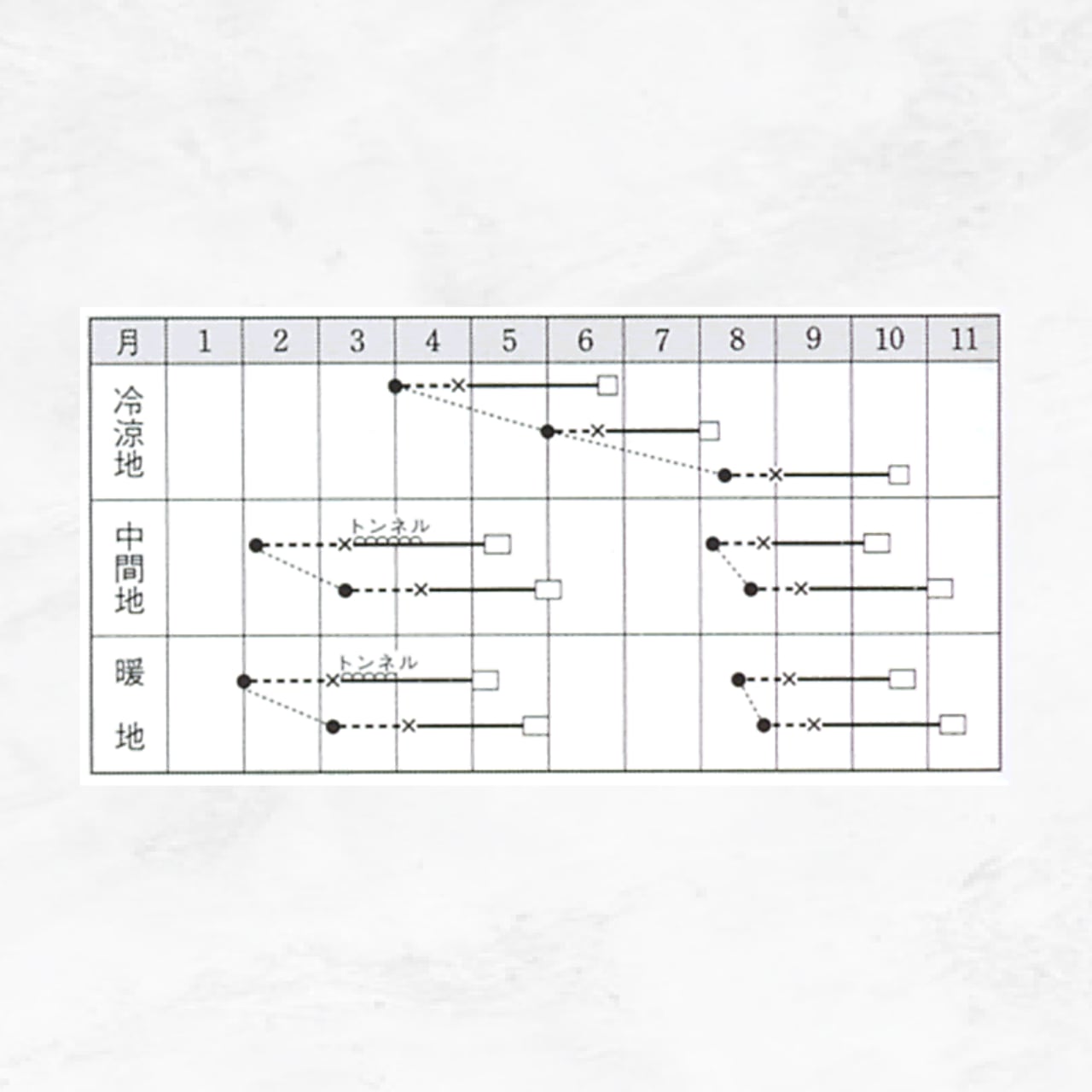 ●栽培条件の異なる幅広い時期での作付けが可能であるが、この適応能力を最大限に生かすためには、作付時期に応じた肥培管理が大切。