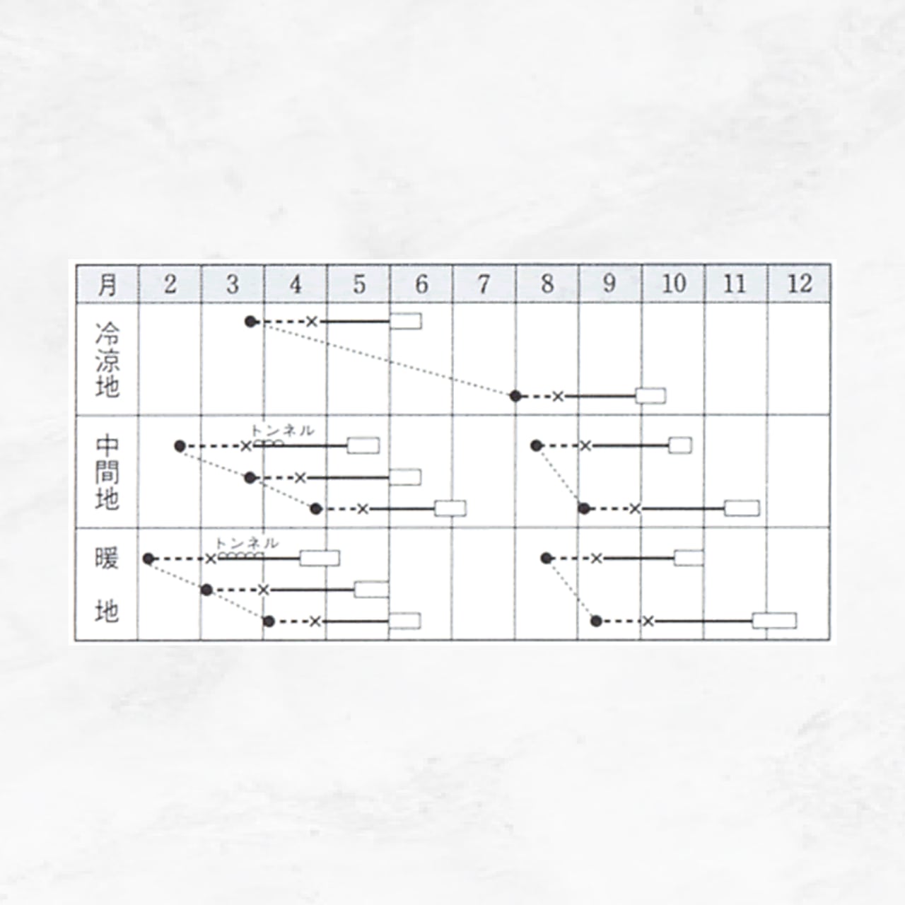 ●元肥主体で初期から肥効を高めて、収穫期にはやや肥効を落ち着かせ、チッソの遅効きや過湿による腐敗に注意する。